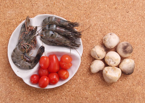 Nguyên liệu nấu lẩu Thái chua cay : - 6 con tôm sú - 10 quả cà chua bi (cắt đôi) - 6-8 cái nấm rơm - Nước dùng: 15-20 con tôm cỡ vừa; 5-6 lá chanh; 2 quả chanh vắt nước; 20g rau mùi; 1 nhánh riềng thái lát; 3 cây sả; 2 tép tỏi; 2 quả ớt đỏ; ...