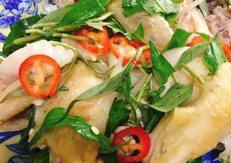 Cách Làm Gà luộc chín, rau răm, hảnh tây rửa sạch sẽ. Hành tây dùng dao hai lửa bào mỏng(hoặc cắt ...
