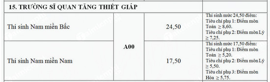 Điểm chuẩn Trường Sĩ Quan Tăng - Thiết Giáp năm 2017 cơ sở phía Bắc là 24.5 điểm và cơ sở phía Nam là 17.5 điểm Đổi với những thí sinh tra cứu ...
