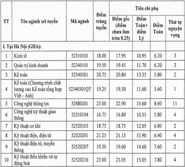 Điểm chuẩn Đại học Giao thông Vận tải 2017 cơ sở phía bắc, điểm xét tuyển