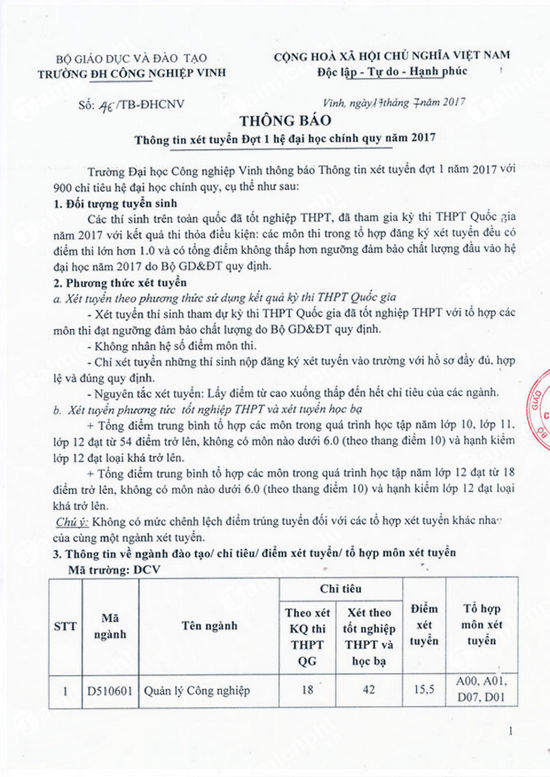 Điểm chuẩn Đại học công nghiệp Vinh 2017, điểm xét tuyển