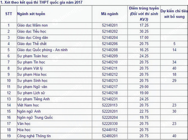 Điểm chuẩn Đại học Sư phạm Hà Nội 2 năm 2017, điểm xét tuyển