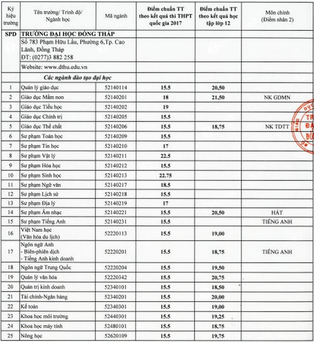 Điểm chuẩn Đại học Đồng Tháp 2017, điểm xét tuyển