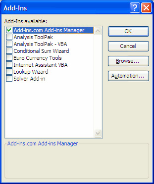 Excel add-in là phần mở rộng trong chương trình Excel. Khi cài đặt, đó là một ứng dụng nhỏ, nó sẽ thêm một hàm để Excel có thể dễ dàng thực hiện những thao tác phức tạp. Cài đặt Add-ins Excel - Từ menu Tools , kích Add-ins . Hộp thoại Add-ins hiển thị - Nếu bạn muốn add-in ...