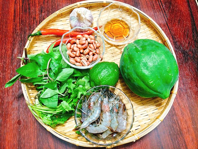 Chuẩn bị nguyên liệu làm nộm đu đủ : - 1 quả đu đủ xanh - 200gr tôm tươi - 1 củ cà rốt - 1-2 quả ớt sừng - 1 củ tỏi - 100gr lạc rang chín - Nước cốt chanh hoặc giấm gạo - Đường trắng ...