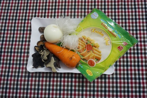 Nguyên liệu: - Bánh đa nem: 1 gói - Miến: 50-100 g - Cà rốt, hành tây mỗi thứ ½ củ - Nấm hương, mộc nhĩ: 4-5 tai (ngâm nở, rửa sạch) - Hành lá - Dầu ăn, bột canh, mì chính, hạt tiêu ...